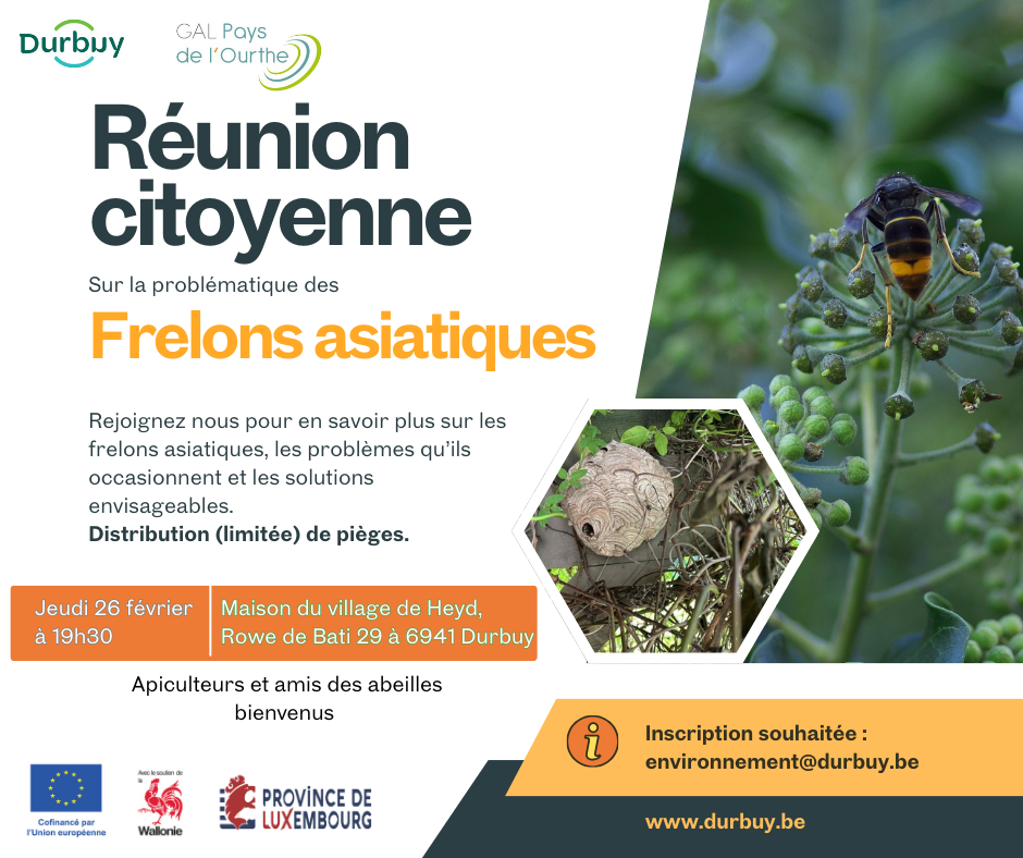 - Si le nid se situe sur le domaine public de la ville de Durbuy, contactez le service environnement par e-mail à l’adresse audrey.petitjean@durbuy.be. Indiquer la localisation (rue, n°, code postal), ajouter idéalement une photo du nid observé et un numéro de téléphone pour vous contacter si nécessaire. La neutralisation sera prise en charge par la Ville de Durbuy.